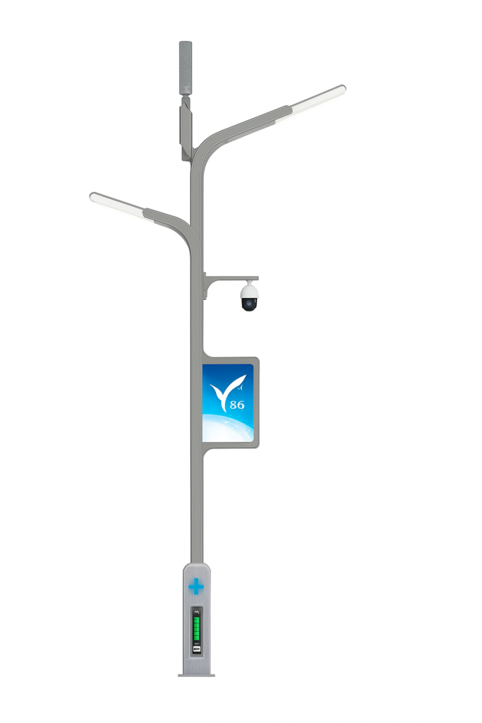Each smart pole combines LED illumination, Wi-Fi hotspot, AI camera, environmental monitoring, EV charging, and information display, enabling cities to become smarter and more connected.