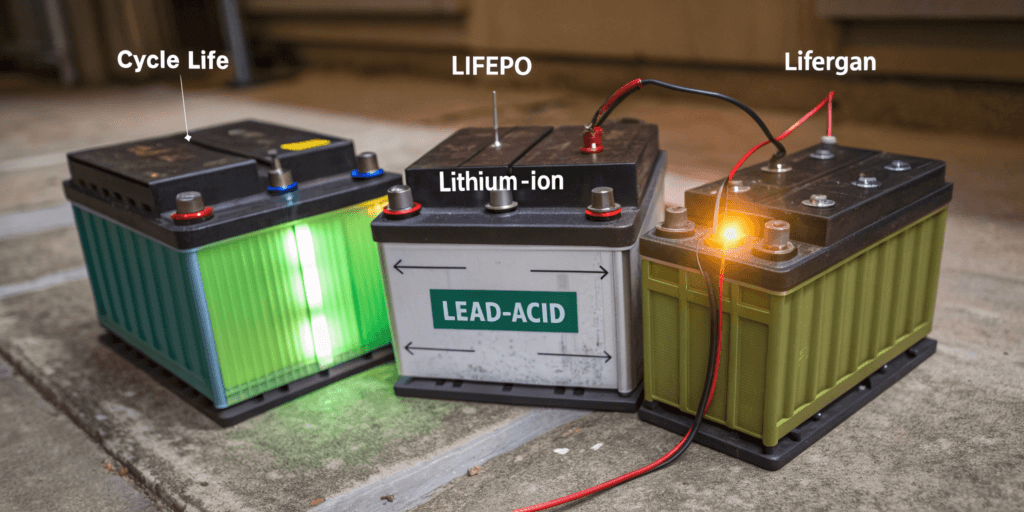 LiFePO₄ (Lithium Iron Phosphate) offers the best cycle life (2000–3000+), temperature tolerance, and safety.